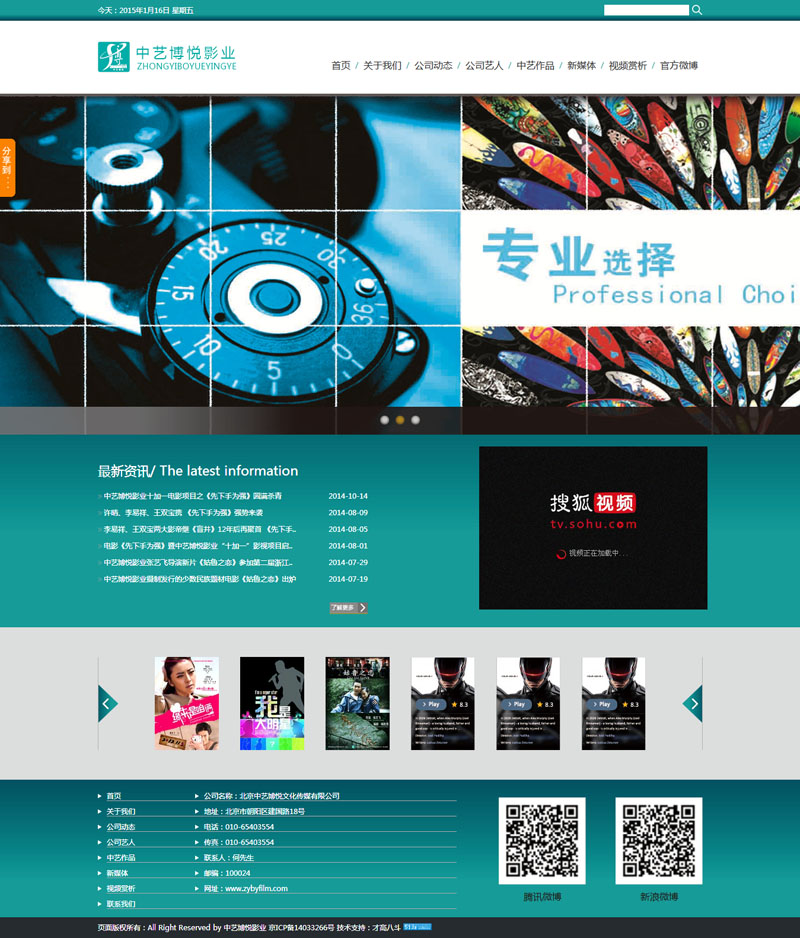 北京中藝博悅文化傳媒公司是中國大型綜合性文化娛樂公司之一,擁有國際化經(jīng)營管理團(tuán)隊(duì),以旗下簽約藝人為公司主要服務(wù)對象,涉及藝人培訓(xùn)、娛樂賽事開發(fā)、影視制作、唱片制作、新媒體、影視發(fā)行、手游等全方位領(lǐng)域。公司一直致力于發(fā)掘國內(nèi)優(yōu)秀藝術(shù)人才,創(chuàng)作不同風(fēng)格優(yōu)秀作品,并廣泛與國內(nèi)一流的創(chuàng)作人、制片人和音樂人隊(duì)伍建立良好的合作關(guān)系。自2008年成立以來已投資制作發(fā)行《緣來是咱倆》《不說不說就不說》《我是大明星》等多部影片,計(jì)劃在2014-2016繼續(xù)投資制作發(fā)行《先下手為強(qiáng)》《鋼管之武》等二十余部影片。