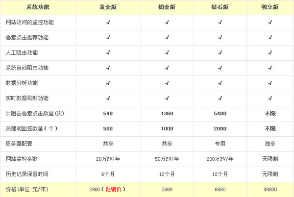 防惡意點擊效果好 處理效率高:強硬的技術保障,防惡意點擊系統(tǒng)每秒可以完成數(shù)千次的分析處理,可以阻擊代理Ip惡意點擊、地址欄惡意點擊、外站惡意點擊、惡意點擊軟件等多種惡意點擊行為。用戶每年可以節(jié)省50%左右的廣告費。數(shù)據(jù)展示直觀 用戶操作簡單:通過高效的采集網(wǎng)站訪客的點擊數(shù)據(jù),進行專業(yè)、高效、智能化的算法分析,用戶可以在后臺管理系統(tǒng)里直觀的察看阻擊效果,幫助用戶分析網(wǎng)站訪客情況和推廣效果。強力阻擊 處罰惡意點擊用戶:通過簡易的設置,用戶可以精確的阻擊惡意點擊者,本系統(tǒng)可以對阻擊惡意點擊者采取警告、限制訪問、攻擊等反惡意點擊行為。滿意的售后服務 提供全天服務:購買任一款“金盾防惡意點擊系統(tǒng)”的用戶在服務期內可以享受免費安裝服務,24小時全天電話咨詢服務,網(wǎng)絡技術支持服務。