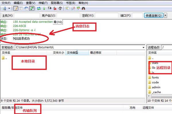 Filezilla界面分為四塊:上面是消息日志,顯示工具的工作狀態(tài);左側(cè)是本地目錄樹(shù);右側(cè)是遠(yuǎn)程目錄;下方是隊(duì)列中的文件。