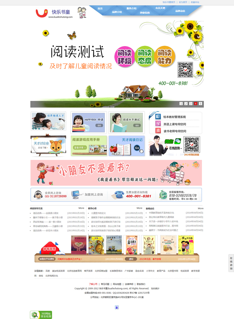 2012年2月,是一家專門致力于兒童教育類項目加盟事業(yè)的公司。公司總部坐落于首都北京,注冊資金100萬人民幣。我們力爭做國內(nèi)兒童教育領(lǐng)域里最有創(chuàng)意,最科學的兒童教育加盟公司。我們從韓國、日本、英國、菲律賓、美國等知名公司引進最成功的項目,造福于中國的孩子,因為中國的騰飛在孩子身上,而孩子的騰飛關(guān)鍵在于正確有效的教育!加盟我們的項目您將為中國的兒童教育事業(yè)畫上濃墨重彩的一筆!
