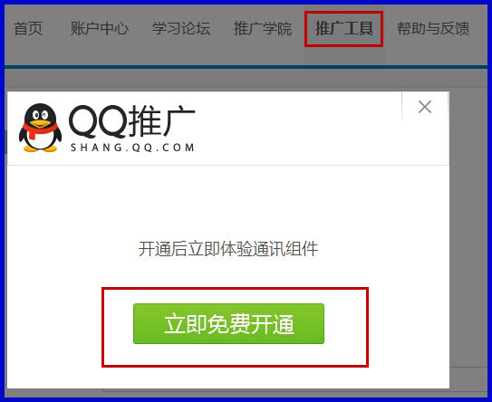 二、用你的QQ賬號(hào)登陸之后,點(diǎn)“推廣工具”,按下圖所示,點(diǎn)擊“立即免費(fèi)開(kāi)通”。這個(gè)必須開(kāi)通,否則不能臨時(shí)會(huì)話,就會(huì)顯示“未啟用”。這一步是關(guān)鍵,必須開(kāi)通。